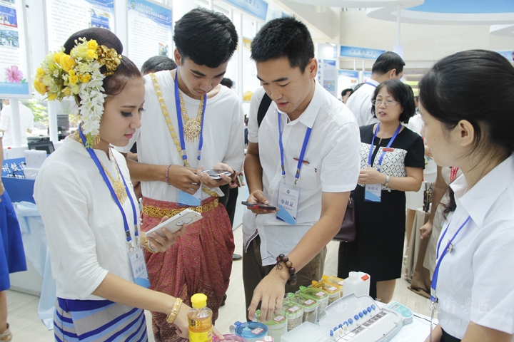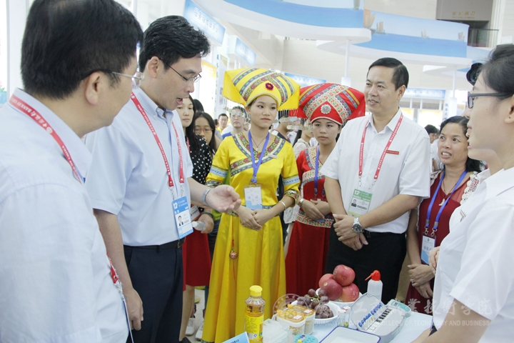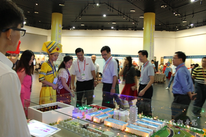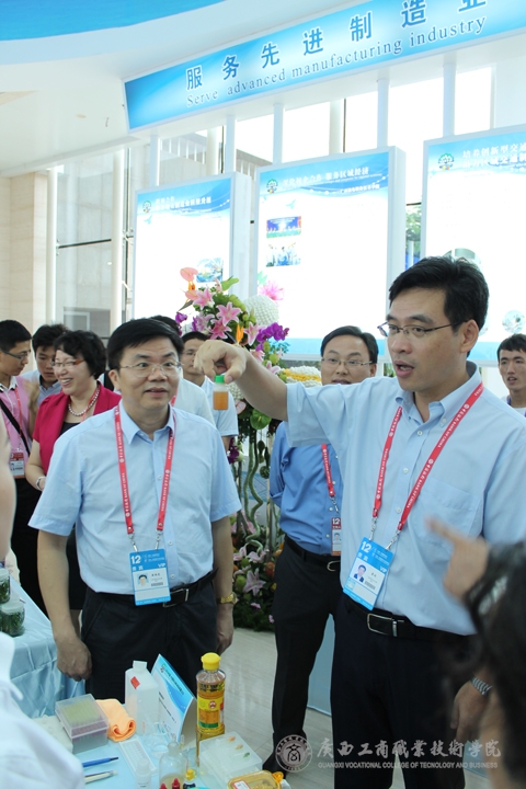 2015年9月19日,自治區(qū)高校工委書記、教育廳廳長(zhǎng)秦斌、副廳長(zhǎng)黃雄彪、職成處萬鋒鋒副處長(zhǎng)等一行觀看東盟職教聯(lián)展。
