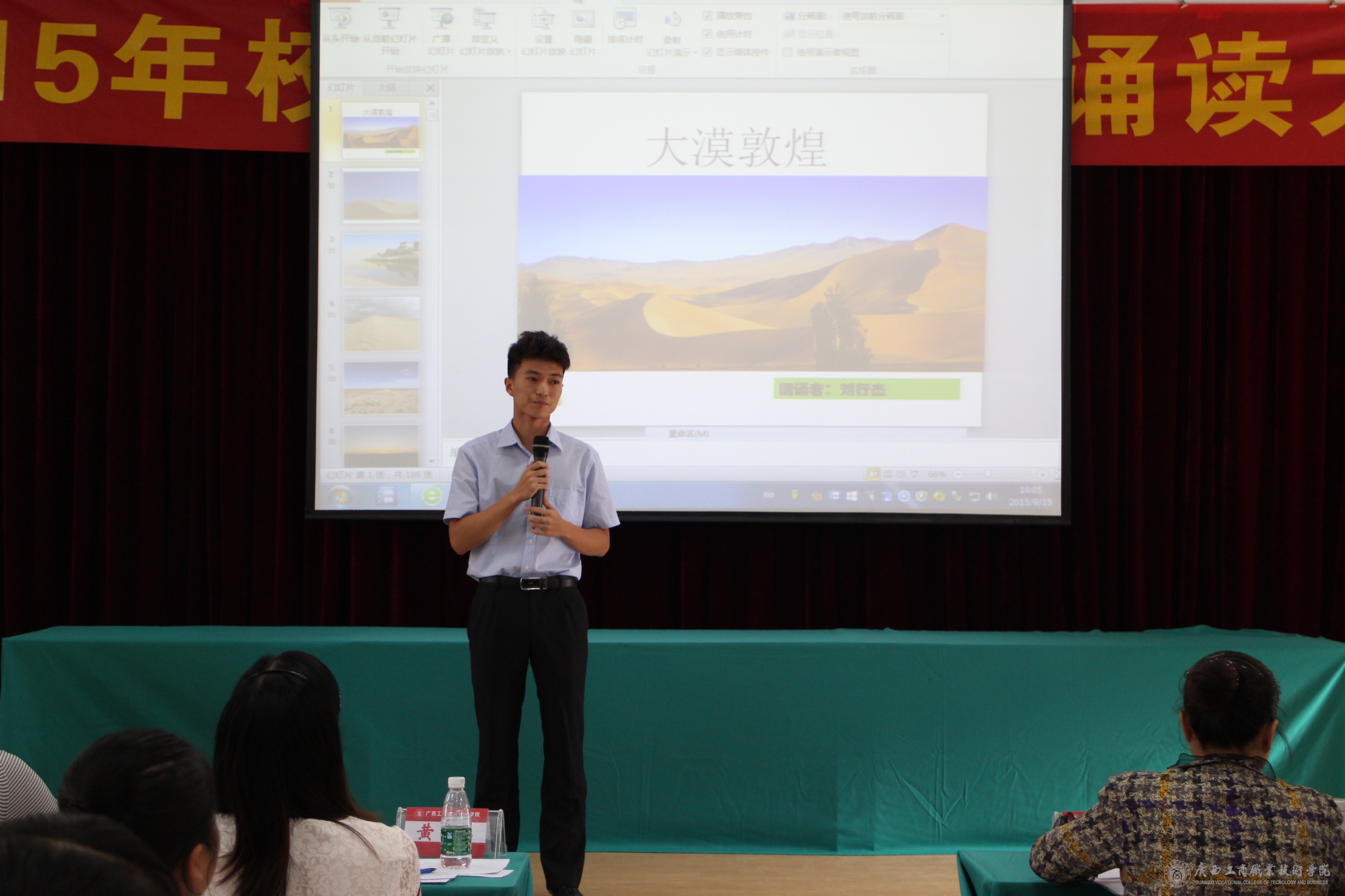 在今年的“中華經(jīng)典詩(shī)詞誦讀”學(xué)院決賽前夕,我院各系部積極開展預(yù)賽,進(jìn)行選拔。決賽當(dāng)天,雷光教授、甘敏軍副教授、黃英副教授、周紅湘副教授、梁曉霞老師、劉佳家老師、賈雨瀟老師擔(dān)任評(píng)委。會(huì)電1431班、酒店1502班學(xué)生,以及相關(guān)社團(tuán)的學(xué)生代表參加了活動(dòng)。