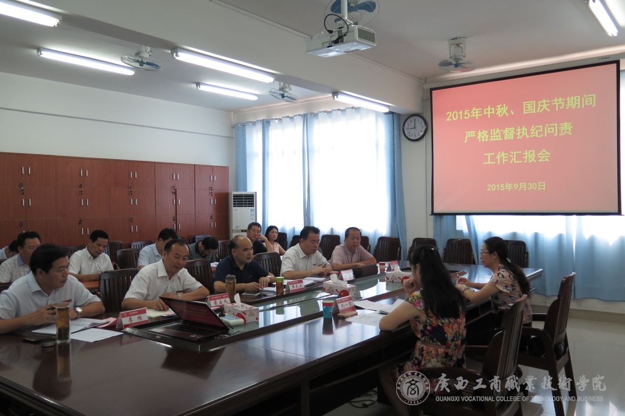 9月30日上午,關于2015年中秋、國慶節(jié)期間嚴格監(jiān)督執(zhí)紀問責工作匯報會在我院校本部教學樓2109會議室召開,自治區(qū)糧食局黨組成員、紀檢組組長歐澤馨和局機關黨委副調研員冼一紫參加工作匯報會,聽取2015年中秋、國慶節(jié)期間嚴格監(jiān)督執(zhí)紀問責工作的匯報,學院領導覃武云、陳杰、蒙啟成、李仕欽、李維,各黨政部門負責人、監(jiān)察審計室全體人員參加了會議。