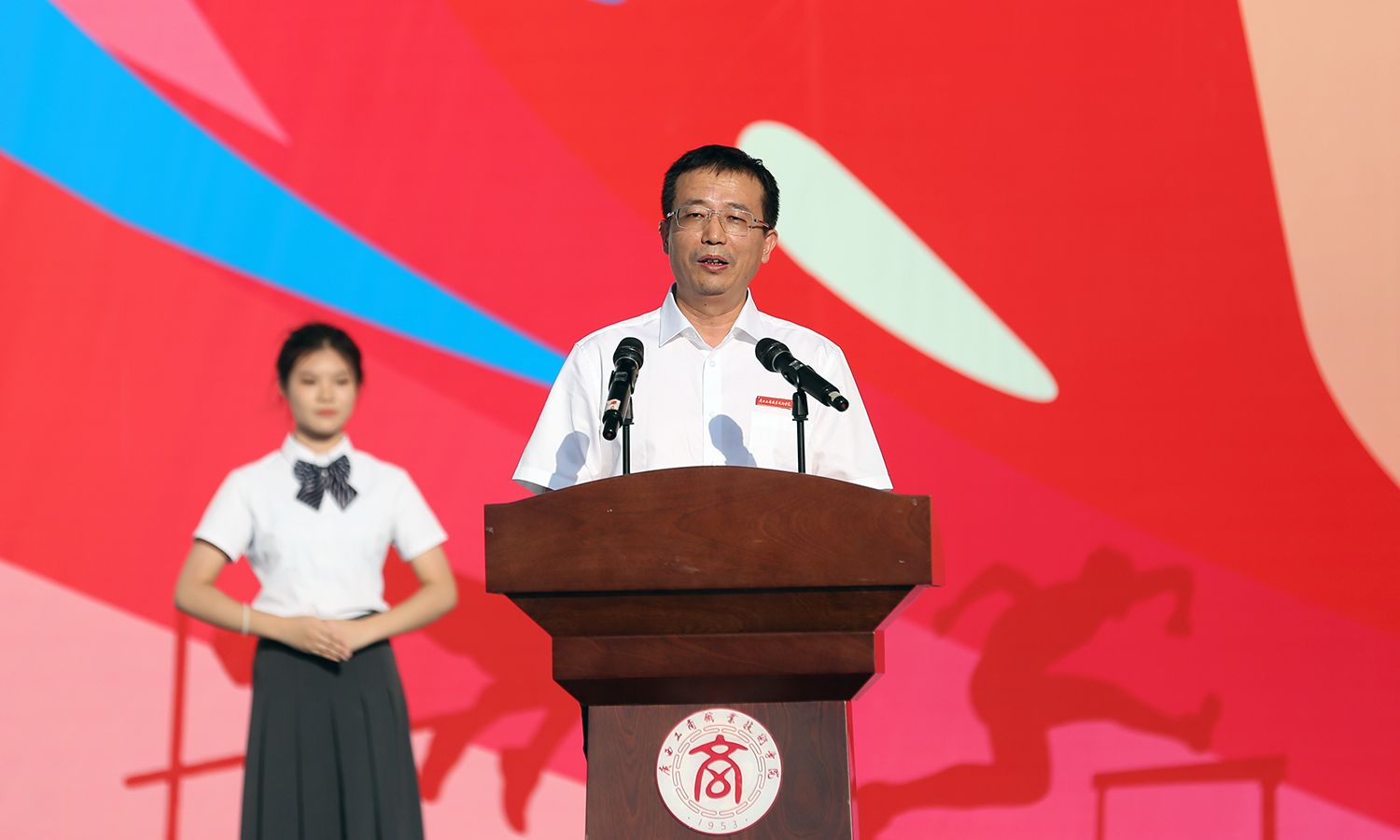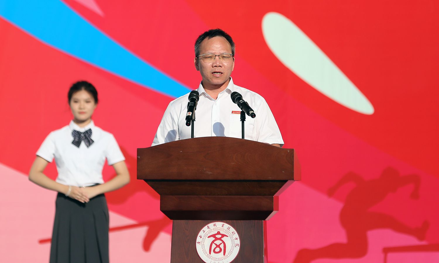 隨后,劉進(jìn)校長為閉幕式致辭,他向取得優(yōu)異成績的運(yùn)動(dòng)員表示祝賀,對(duì)辛勤付出的全體工作人員表示衷心感謝。他表示,本次運(yùn)動(dòng)會(huì)精彩紛呈,運(yùn)動(dòng)員們?cè)谫悎錾夏阕肺亿s、奮勇爭先,彰顯了拼搏進(jìn)取、團(tuán)結(jié)友愛的精神,讓我們感受到了運(yùn)動(dòng)的魅力與青春的力量,這是一場青春閃耀的盛會(huì),不僅賽出了風(fēng)格,更賽出了友誼和高水平。劉進(jìn)校長強(qiáng)調(diào),體育運(yùn)動(dòng)不僅是鍛煉身體的方式,更是培養(yǎng)意志品質(zhì)、增強(qiáng)團(tuán)結(jié)合作的重要途徑,希望同學(xué)們將運(yùn)動(dòng)會(huì)中展現(xiàn)的拼搏精神和團(tuán)結(jié)意識(shí)延續(xù)到今后的學(xué)習(xí)和生活中。他勉勵(lì)廣大師生要堅(jiān)定信念,求真務(wù)實(shí),繼續(xù)秉持對(duì)體育的熱愛,積極鍛煉身體,增強(qiáng)體魄,為校園注入更多活力與光彩;要努力工作,勤奮學(xué)習(xí),積極為學(xué)校新一輪“雙高”建設(shè)貢獻(xiàn)自身的智慧與力量,共同譜寫學(xué)校輝煌的新篇章。