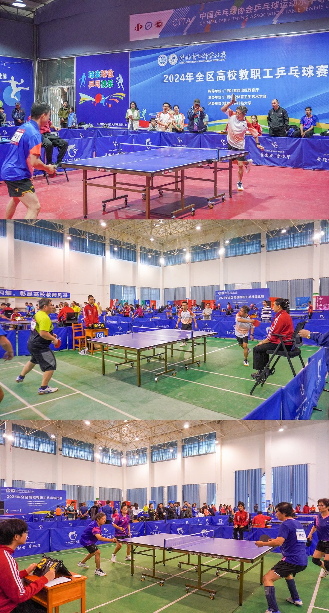 2024年全區(qū)高校教職工乒乓球比賽于11月4日—8日在桂林電子科技大學(xué)火熱開戰(zhàn),來自全區(qū)共35支高校隊(duì)伍近532名運(yùn)動(dòng)員、教練員參賽。本次比賽指導(dǎo)單位為自治區(qū)教育廳,由廣西體育衛(wèi)生學(xué)術(shù)學(xué)會(huì)主辦,桂林電子科技大學(xué)承辦。學(xué)校校長劉進(jìn)擔(dān)任領(lǐng)隊(duì)率隊(duì)參加比賽,學(xué)校黨委副書記安仲文擔(dān)任教練兼隊(duì)員。