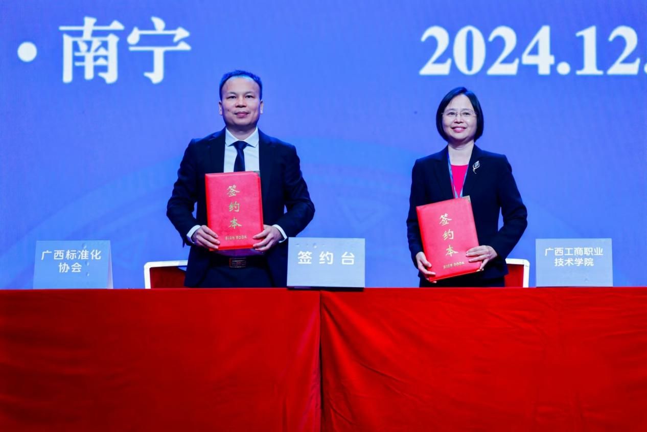 學(xué)校黨委副書記、紀(jì)委書記韋云鳳出席大會,與廣西標(biāo)準(zhǔn)化協(xié)會會長謝宏昭等協(xié)會領(lǐng)導(dǎo)進(jìn)行了深入交流,并與廣西標(biāo)準(zhǔn)化協(xié)會簽訂標(biāo)準(zhǔn)化發(fā)展戰(zhàn)略合作框架協(xié)議。在簽約儀式上,韋云鳳表示,與廣西標(biāo)準(zhǔn)化協(xié)會的合作是貫徹落實(shí)國家標(biāo)準(zhǔn)化戰(zhàn)略的重要舉措,將為我校的發(fā)展提供強(qiáng)有力的支持,推動我校的教學(xué)質(zhì)量和科研水平邁上新臺階。聚焦糧食儲運(yùn)與質(zhì)量安全、市場營銷等高水平專業(yè)群發(fā)展需要制定一批原創(chuàng)性高質(zhì)量團(tuán)體標(biāo)準(zhǔn)和國家標(biāo)準(zhǔn),我校將堅持發(fā)揮標(biāo)準(zhǔn)引領(lǐng)作用,高標(biāo)準(zhǔn)培育和發(fā)展新質(zhì)生產(chǎn)力,助推廣西經(jīng)濟(jì)社會高質(zhì)量發(fā)展。