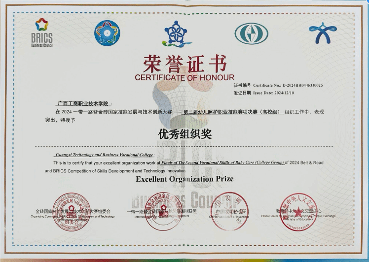 12月7日-9日,2024年一帶一路暨金磚國家技能發(fā)展與技術(shù)創(chuàng)新大賽第二屆幼兒照護(hù)職業(yè)技能賽項(xiàng)全國總決賽(高校組),在湖南岳陽職業(yè)技術(shù)學(xué)院舉行,來自全國80支參賽隊(duì),160名選手同臺(tái)競(jìng)技。經(jīng)過三天的激烈比賽,學(xué)校糧油康旅學(xué)院幼托2301班學(xué)生李巧婷和幼托2302班蔣婷,通過扎實(shí)的專業(yè)知識(shí)和出色的實(shí)操技能,在眾多參賽隊(duì)伍中脫穎而出,以總排名第九,獲得國賽二等獎(jiǎng)的好成績,教師吳小梅、黃文健榮獲優(yōu)秀指導(dǎo)教師,學(xué)校獲得優(yōu)秀組織單位。