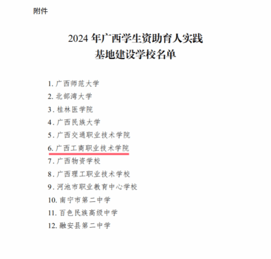 近日,自治區(qū)教育廳發(fā)布了《自治區(qū)教育廳關(guān)于公布2024廣西學(xué)生資助育人實踐基地建設(shè)學(xué)校名單的通知》,我校獲評第二批廣西高校資助育人實踐示范基地建設(shè)高校。這標(biāo)志著我校在資助育人平臺建設(shè)上取得新的突破,也是學(xué)校資助育人工作質(zhì)量不斷提升的重要體現(xiàn)。