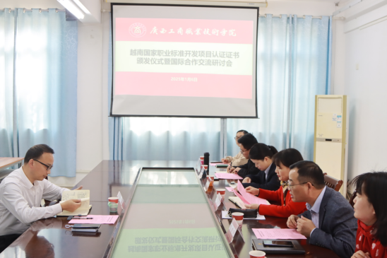 1月6日,學(xué)校在鵬飛校區(qū)舉辦越南國家職業(yè)標(biāo)準(zhǔn)共建項(xiàng)目認(rèn)證證書頒發(fā)儀式暨國際合作交流研討會。學(xué)校教務(wù)處處長覃遠(yuǎn)霞、經(jīng)貿(mào)學(xué)院院長張煌強(qiáng)以及標(biāo)準(zhǔn)研發(fā)團(tuán)隊(duì)主要成員代表,越南國家職業(yè)標(biāo)準(zhǔn)項(xiàng)目秘書處代表武漢叁壹教育科技有限公司副總經(jīng)理李劍參加了會議。