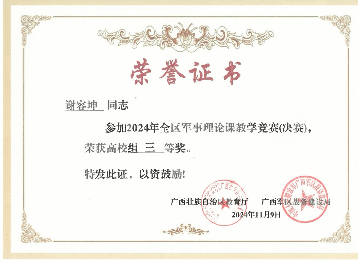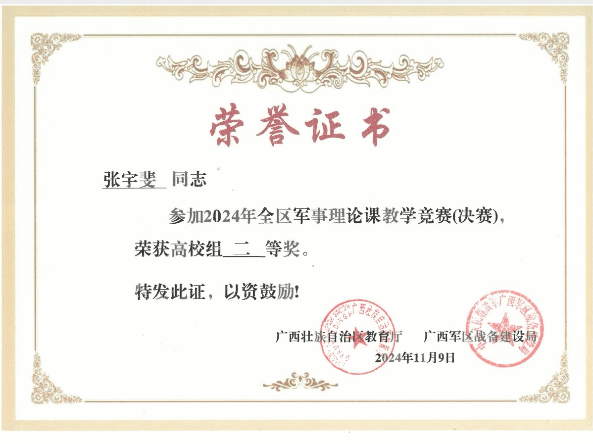 2025年3月5日至7日,廣西高校國(guó)防教育學(xué)會(huì)年會(huì)暨2025年工作會(huì)議在河池市召開。會(huì)議頒發(fā)了2024年軍事課教學(xué)競(jìng)賽獲獎(jiǎng)證書,我校張宇斐、練東曦兩位教師均榮獲二等獎(jiǎng),謝榮坤老師榮獲三等獎(jiǎng)。我校張宇斐、練東曦老師參加會(huì)議并在會(huì)議上領(lǐng)取了由廣西壯族自治區(qū)教育廳、廣西軍區(qū)戰(zhàn)備建設(shè)局相關(guān)領(lǐng)導(dǎo)頒發(fā)的獲獎(jiǎng)證書。