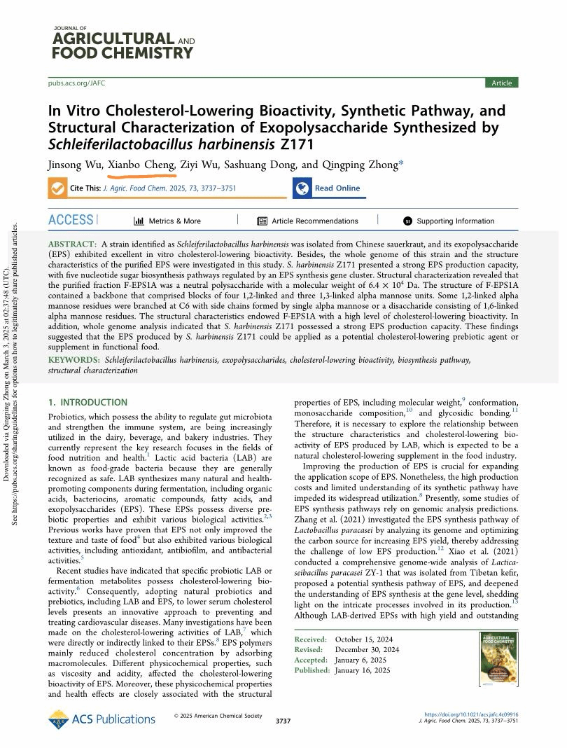 該雜志是一本在農(nóng)林科學領域享有高度聲譽的期刊,創(chuàng)刊于1953年,由American Chemical Society(美國化學學會)出版發(fā)行,是農(nóng)業(yè)和食品化學領域的老牌SCI期刊。我校承擔課題中多糖結(jié)構(gòu)的研究任務,為功能性食品開發(fā)及膽固醇代謝調(diào)控提供了重要理論支持,標志著我校在多糖領域的研究邁上新臺階。