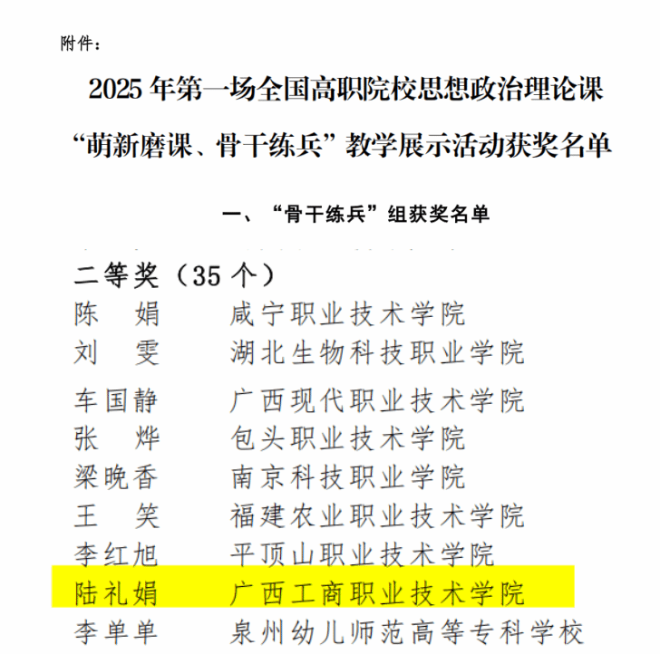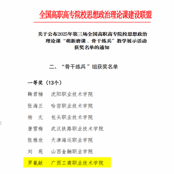 近日,2025年全國高職院校思想政治理論課“萌新磨課、骨干練兵”教學展示活動評選結(jié)果公布。本次活動按照不同課程分為三場,包含萌新磨課”和“骨干練兵”兩大組別,“省內(nèi)初選、線上復選、現(xiàn)場展示”等三個環(huán)節(jié)。我校馬克思主義學院教師羅氰獻榮獲第三場“骨干練兵”組一等獎,陸禮娟榮獲第一場“骨干練兵”組二等獎。