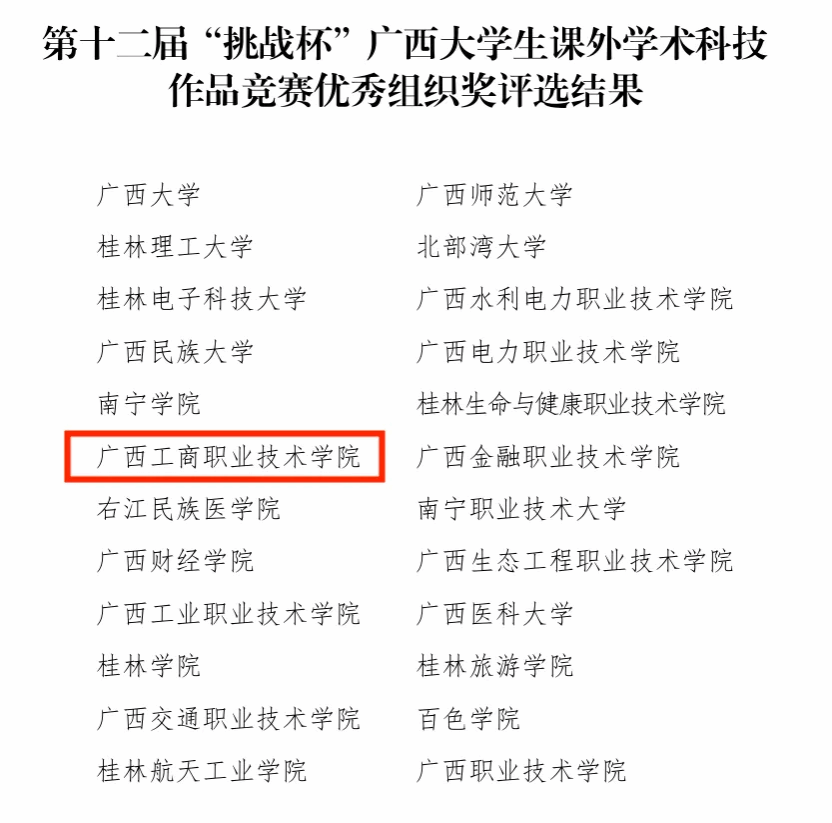 第十二屆 “挑戰(zhàn)杯” 廣西大學(xué)生課外學(xué)術(shù)科技作品競賽已于近日圓滿落幕,此次競賽中,我校共有26個(gè)項(xiàng)目獲獎(jiǎng),其中,獲特等獎(jiǎng)7項(xiàng)、一等獎(jiǎng)5項(xiàng)、二等獎(jiǎng)7項(xiàng)、三等獎(jiǎng)7項(xiàng),并再次獲得“優(yōu)勝杯”1項(xiàng)和優(yōu)秀組織獎(jiǎng)1項(xiàng)。我校特等獎(jiǎng)獲獎(jiǎng)數(shù)量在全區(qū)高校中位列第四,團(tuán)隊(duì)總獲獎(jiǎng)數(shù)位居全區(qū)高職高專學(xué)校首位。