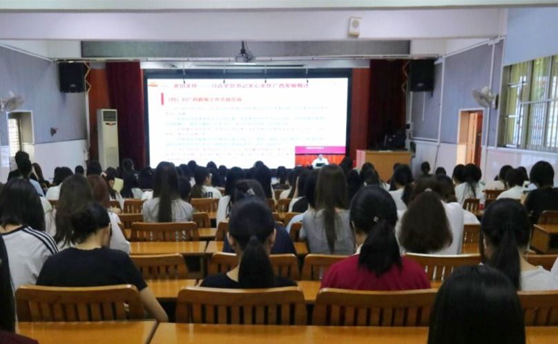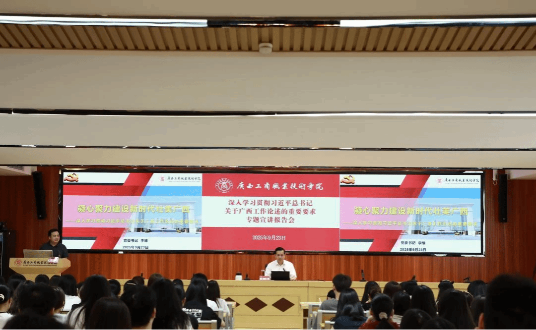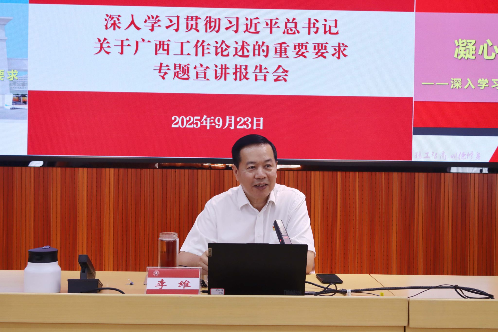 為深入學(xué)習(xí)貫徹習(xí)近平總書記關(guān)于廣西工作論述的重要要求,鑄牢中華民族共同體意識,推動黨的創(chuàng)新理論有效觸達青年群體,根據(jù)自治區(qū)黨委宣傳部《理論宣講青年群體全覆蓋三年行動計劃工作方案》安排,9月23日,學(xué)校在鵬飛校區(qū)舉辦深入學(xué)習(xí)貫徹習(xí)近平總書記關(guān)于廣西工作論述的重要要求專題宣講報告會,學(xué)校黨委書記李維作題為《凝心聚力建設(shè)新時代壯美廣西——深入學(xué)習(xí)貫徹習(xí)近平總書記關(guān)于廣西工作論述的重要要求》的專題宣講報告。宣講報告會采取線下講授、線上直播結(jié)合的形式展開,全體在校生聽取報告會。