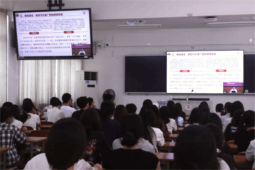 宣講報告會站位高遠、主題鮮明、內(nèi)容豐富、講解深入淺出。宣講報告會結(jié)束后,同學(xué)們表示,將牢記囑托、感恩奮進,努力夯實專業(yè)基礎(chǔ),把個人奮斗融入新時代壯美廣西建設(shè)中,爭當助力廣西高質(zhì)量發(fā)展的生力軍。