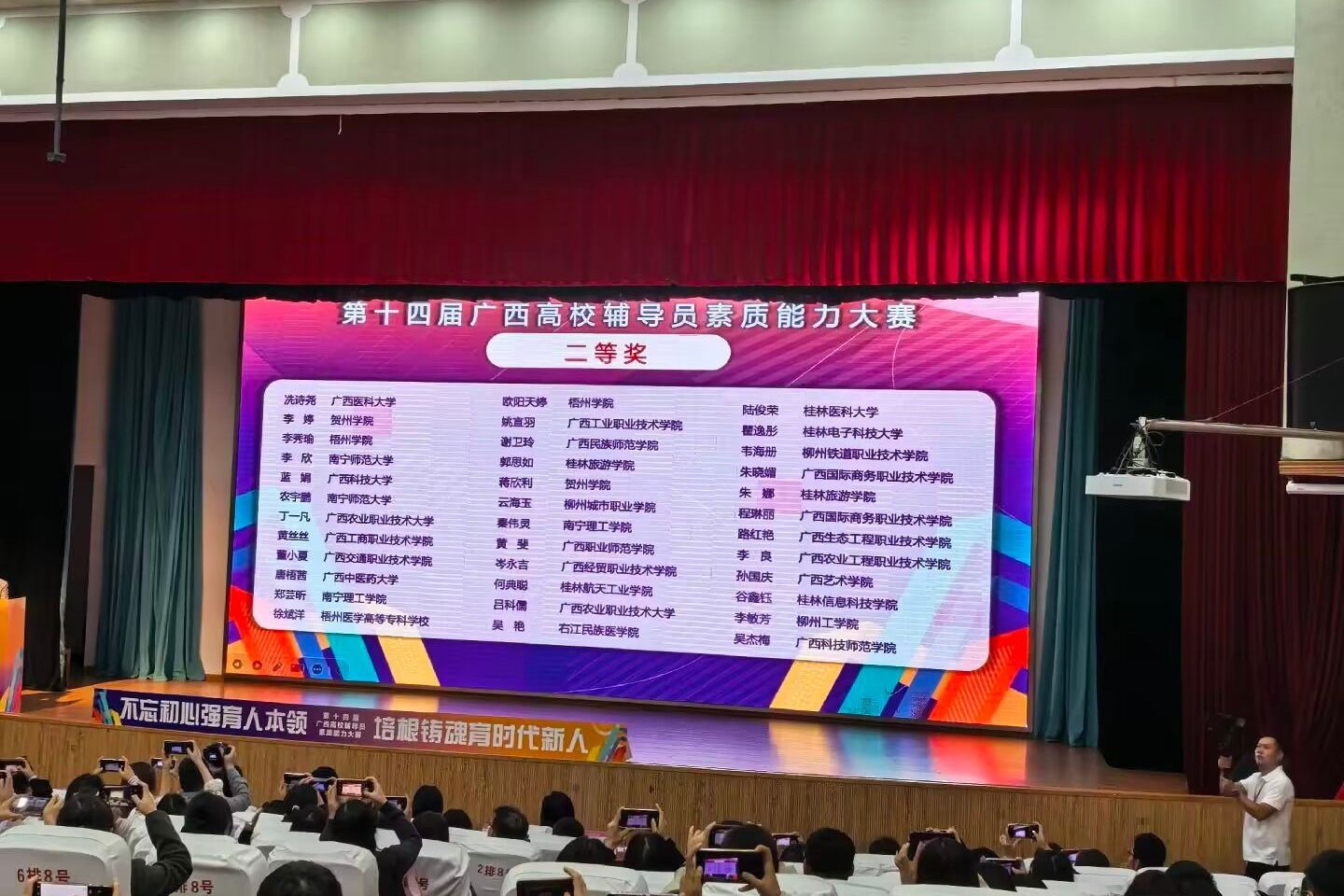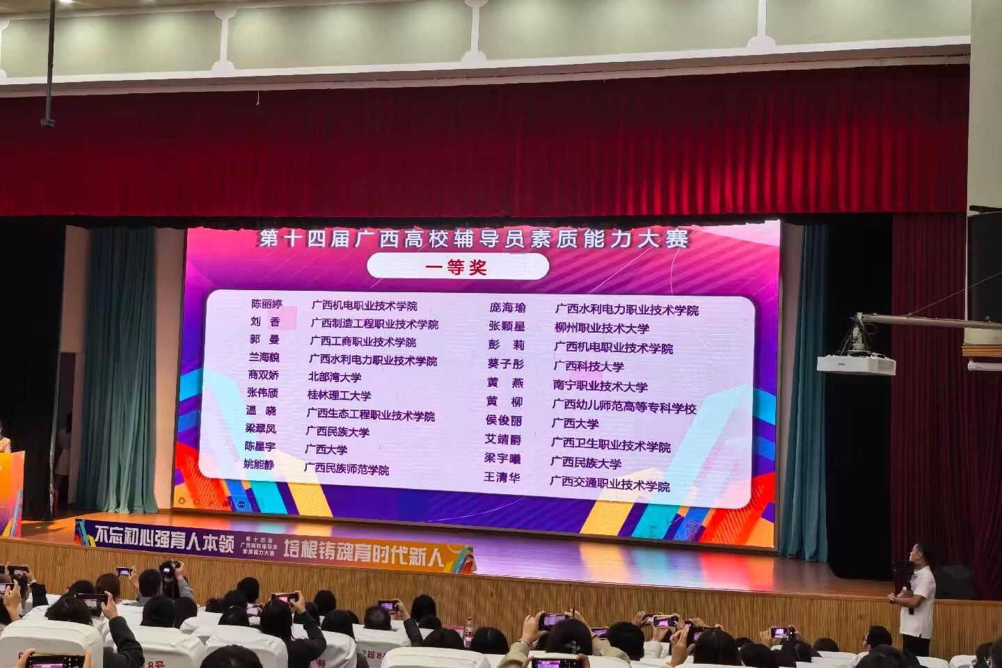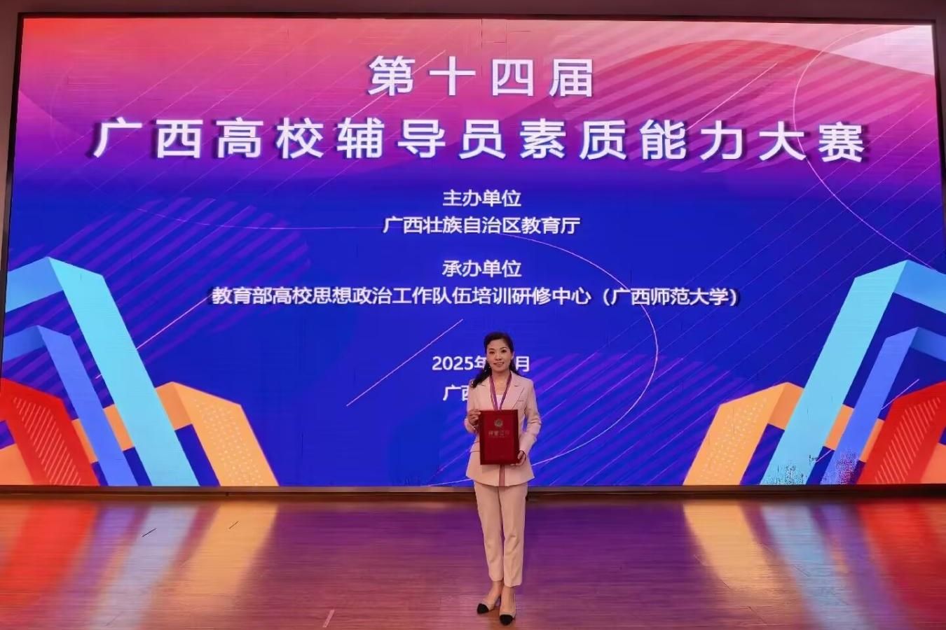 2025年10月29日至31日,由廣西壯族自治區(qū)教育廳主辦、教育部高校思想政治工作隊(duì)伍培訓(xùn)研修中心(廣西師范大學(xué))承辦的第十四屆廣西高校輔導(dǎo)員素質(zhì)能力大賽(簡(jiǎn)稱“大賽”)在廣西桂林圓滿落下帷幕,來自全區(qū)高校的113名參賽選手同臺(tái)競(jìng)技。經(jīng)過激烈角逐,我校參賽選手——經(jīng)貿(mào)與康旅學(xué)院郭曼老師榮獲一等獎(jiǎng)、會(huì)計(jì)學(xué)院黃絲絲老師榮獲二等獎(jiǎng)。