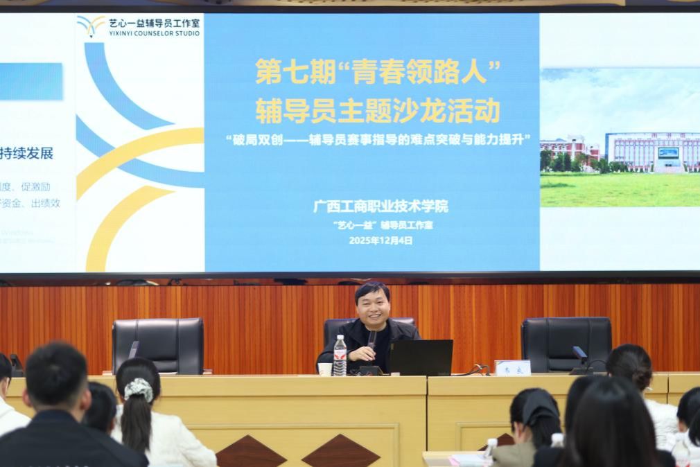 2025年12月4日,由廣西工商職業(yè)技術學院藝心一益輔導員工作室承辦的第七期“青春領路人”輔導員主題沙龍在鵬飛校區(qū)成功舉行。本次沙龍以“破局雙創(chuàng)——輔導員賽事指導的難點突破與能力提升”為主題,匯聚了區(qū)內多所高職院校的輔導員代表,旨在通過深度交流與智慧碰撞,共同破解指導難題,提升育人本領,強化輔導員作為學生成長“青春引路人”的使命擔當。學校黨委學生工作部(處)負責人、各二級學院代表、全體專職輔導員及兄弟院校代表應邀參加。