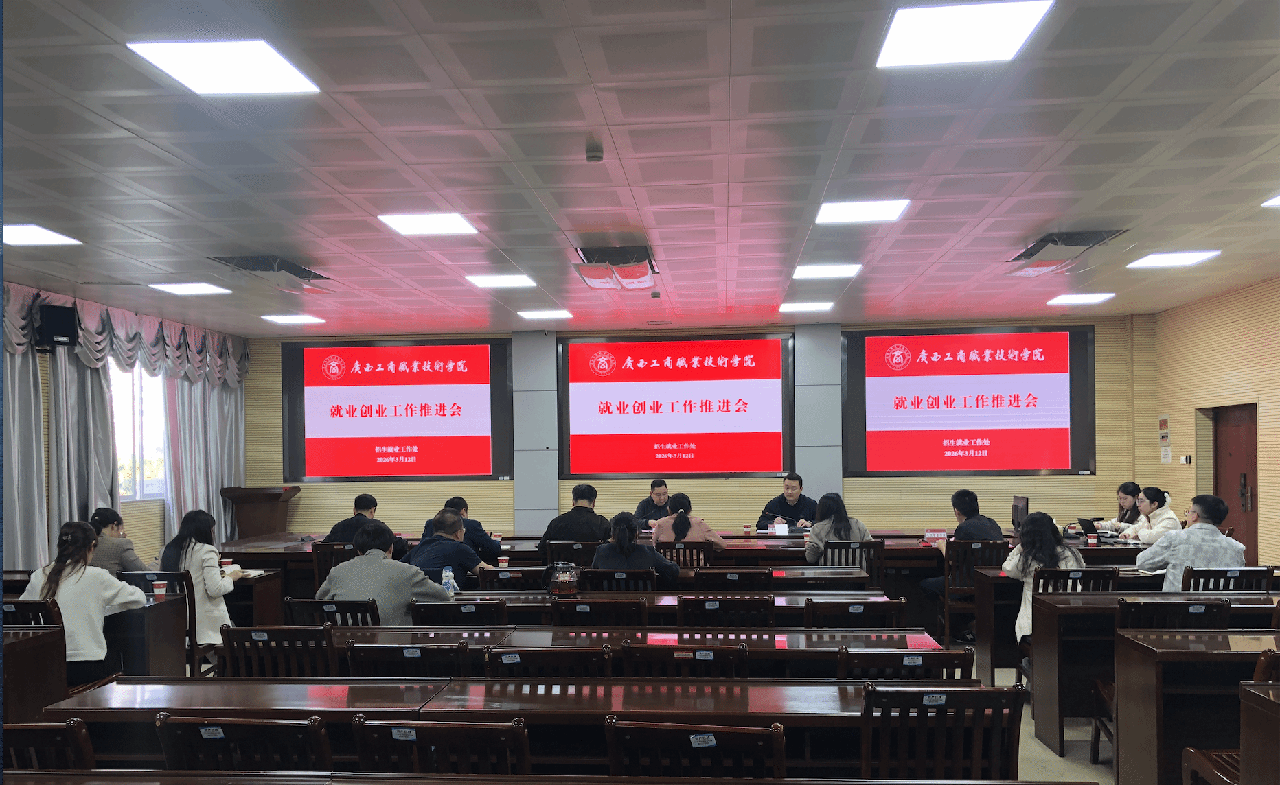 為扎實(shí)推進(jìn)2026年畢業(yè)生就業(yè)創(chuàng)業(yè)重點(diǎn)工作,全面落實(shí)訪企拓崗專項(xiàng)行動部署,切實(shí)提升畢業(yè)生就業(yè)質(zhì)量與就業(yè)服務(wù)水平,3月12日,學(xué)校在鵬飛校區(qū)召開2026年3月就業(yè)創(chuàng)業(yè)工作推進(jìn)會。學(xué)校副校長陳寧春,招生就業(yè)工作處相關(guān)工作人員、各二級學(xué)院主要負(fù)責(zé)人、分管就業(yè)工作副院長及就業(yè)干事參加會議。