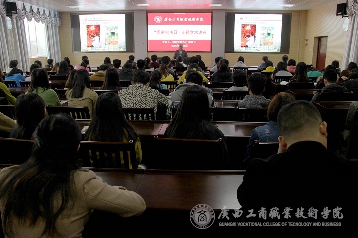 2015年12月4日上午,為引導我校學生弘揚法治精神,普及憲法法律知識,學院黨委書記覃武云在學院2119會議室為經(jīng)管系營策1432班和財信系電商1431班全體同學作“增強憲法意識,維護憲法權(quán)威”的專題學術講座。社科部全體思政理論課教師、各系部教師代表參加了聽課。