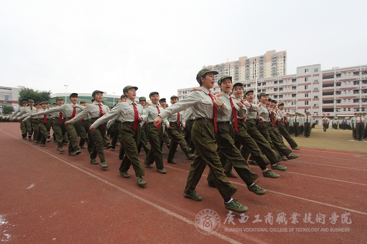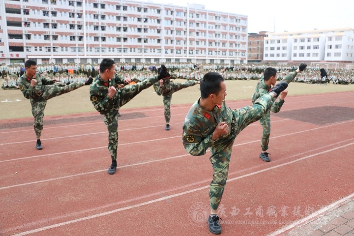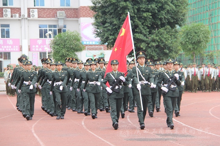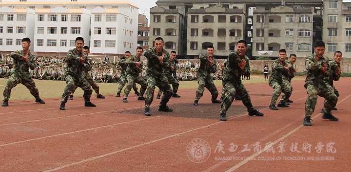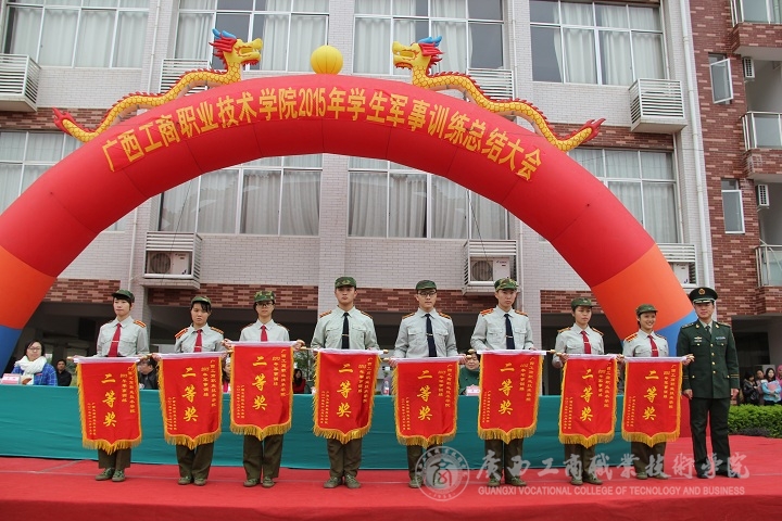 列隊檢閱完畢,武警廣西總隊直屬支隊曾又群副大隊長宣布軍訓(xùn)評選名單。學(xué)院黨委書記覃武云,武警廣西總隊直屬支隊政治處副主任楊和奎以及各系部主任分別為軍訓(xùn)獲獎班級頒發(fā)錦旗。緊接著教官向全體師生展示了列隊、擒拿格斗中的倒功和軍體拳等表演。動作整齊,雄姿英發(fā),軍體拳聲聲有力,摔擒表演更是博得滿場喝彩。