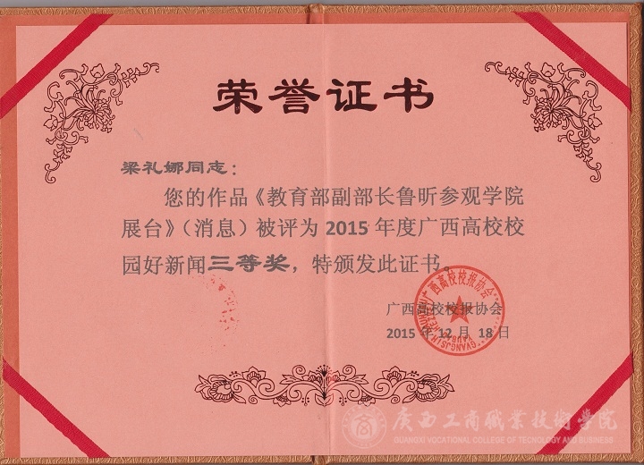 我院官網(wǎng)榮獲“最佳新聞網(wǎng)站”三等獎;我院官網(wǎng)《掛職干部專題》榮獲“最佳新聞網(wǎng)站欄目”三等獎;我院學生梁禮娜《教育部副部長魯昕參觀學院我院展臺》榮獲“校園好新聞”三等獎。