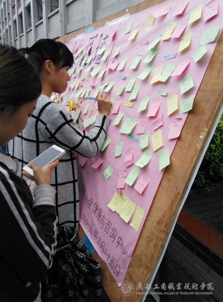 本次大學(xué)生心理健康與咨詢中心所舉行的現(xiàn)場(chǎng)宣傳活動(dòng)吸引了很多同學(xué)的積極參與,他們或是認(rèn)真觀看展板圖上的心理趣味圖、或是在心愿墻上美美的寫上自己心愿,或是興高采烈地領(lǐng)取充滿正能量的書簽或是在善愛(ài)自我,遠(yuǎn)離網(wǎng)絡(luò)的橫幅上留下了自己的名字,活動(dòng)還向全院同學(xué)們發(fā)出倡議 “生活離不開網(wǎng)絡(luò),但網(wǎng)絡(luò)不是生活!”,各項(xiàng)活動(dòng)得到了同學(xué)們的強(qiáng)烈響應(yīng),在簽名處擠滿了人,橫幅上密密麻麻的寫滿了字。同時(shí)本次活動(dòng)設(shè)置了心理健康活動(dòng)卡蓋章環(huán)節(jié),這是心理健康教育課程的一次創(chuàng)新。