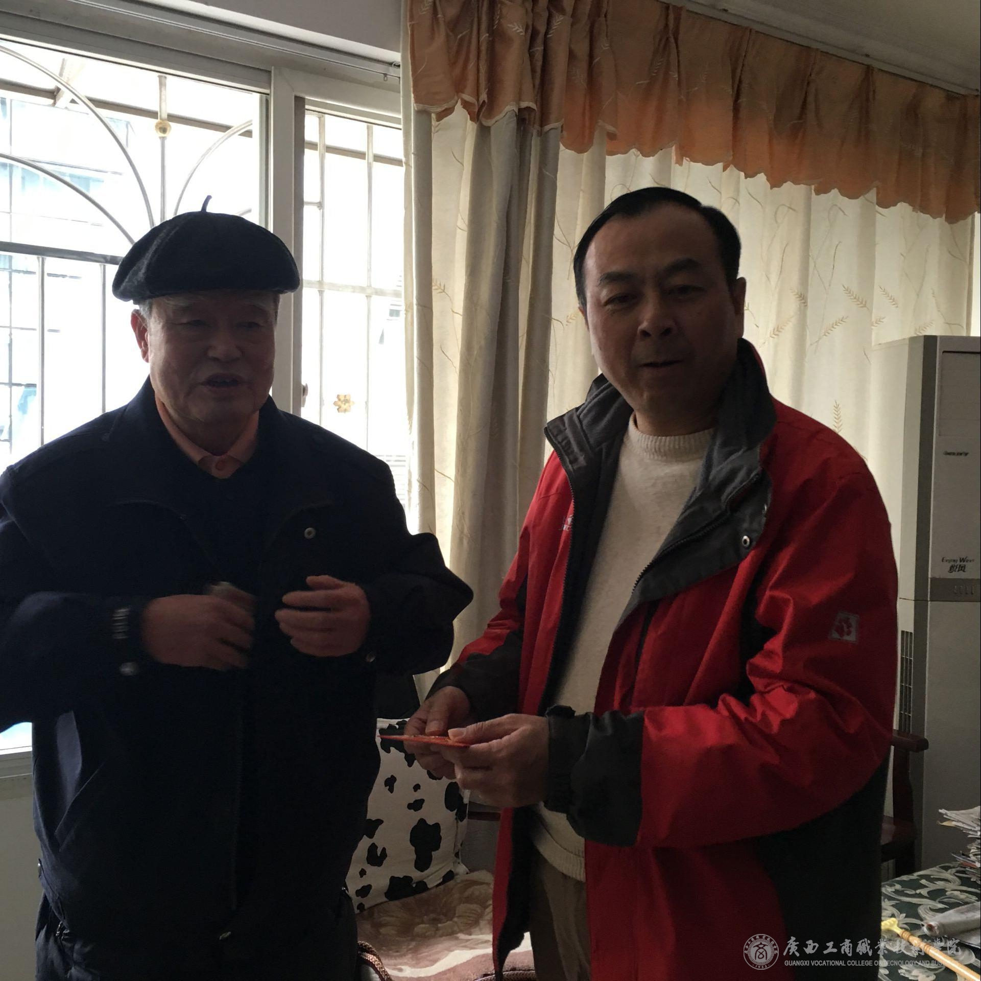 春節(jié)將近、年味漸濃。節(jié)前學(xué)院開(kāi)展了春節(jié)走訪慰問(wèn)活動(dòng)。黨委副書(shū)記、工會(huì)主席蒙啟成在工會(huì)和人事處同志的陪同下來(lái)到離休老干部家中,代表學(xué)院黨委送上慰問(wèn)金和新春祝福。