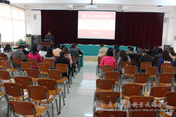 2016年2月28日15:00,我院在校本部教學(xué)樓2145報(bào)告廳舉辦2015—2016學(xué)年寒假學(xué)生工作培訓(xùn)班。學(xué)院黨委副書記蒙啟成、各系黨總支書記、系學(xué)工副主任、就業(yè)副主任、全體輔導(dǎo)員及學(xué)工處全體人員參加了培訓(xùn),由黨委學(xué)工部副部長(zhǎng)張居設(shè)主持。