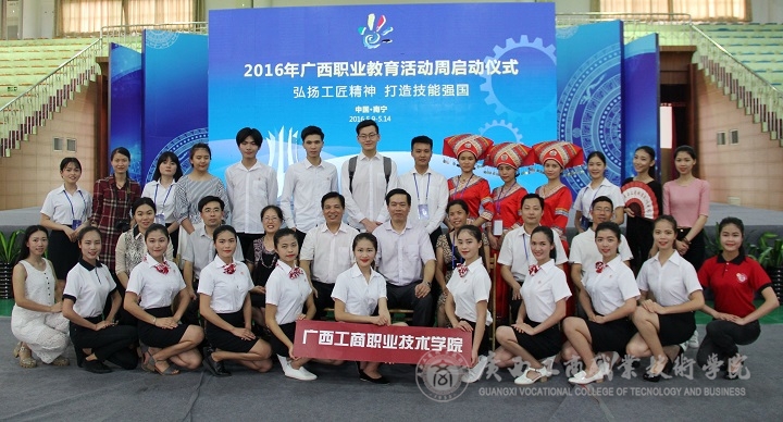 (我院參展團(tuán)隊(duì)在2016年廣西職業(yè)教育活動(dòng)周啟動(dòng)儀式現(xiàn)場(chǎng)合影留念)