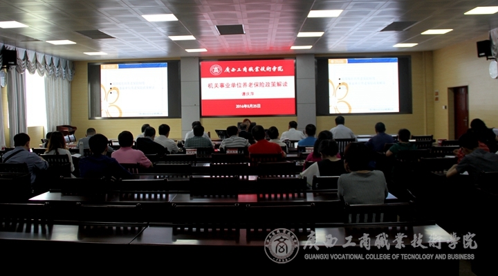 2016年5月25日下午,我院在校本部2119會議室舉辦機關(guān)事業(yè)單位養(yǎng)老保險政策解讀專題講座。學院黨委書記覃武云、院長陳杰、黨委副書記蒙啟成、副院長李仕欽、副院長李維、學院中層以上領(lǐng)導及業(yè)務部門工作人員參加了本次講座。本次講座由自治區(qū)社保局基本養(yǎng)老保險經(jīng)辦管理處主任科員譚慶萍主講。