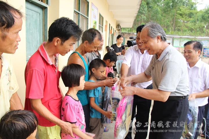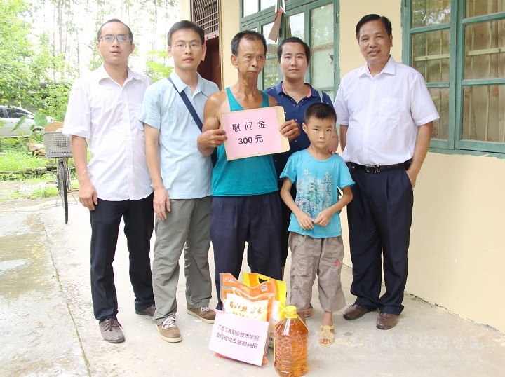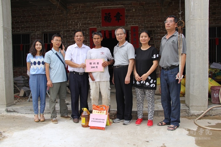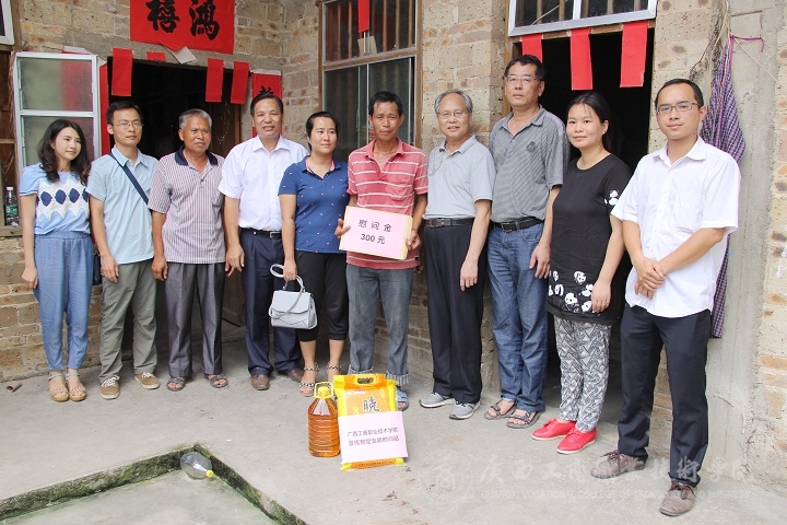 2016年7月8日,學院黃永蓬副廳級調(diào)研員率黨委宣傳部部長韋勝強、后勤管理處處長付光、宣傳部黨員教師等一行五人前往陸川縣看望駐四樂村第一書記羅北戰(zhàn)同志,走訪慰問該村老黨員、困難黨員、困難群眾,并為當?shù)匦W困難學子捐獻學習用品。