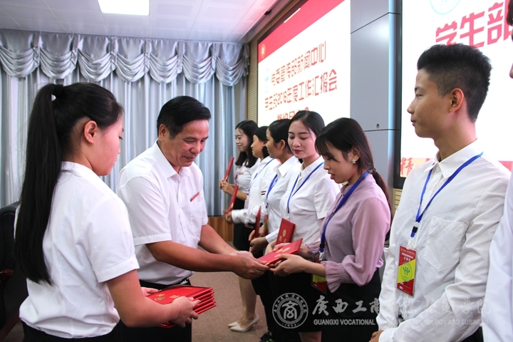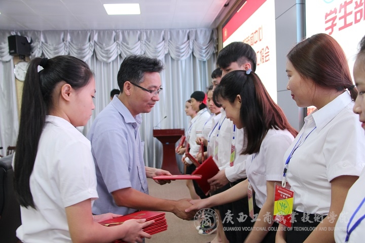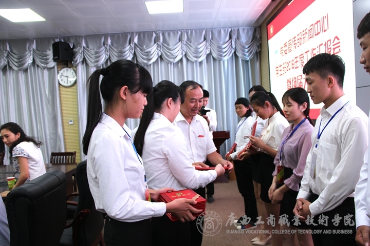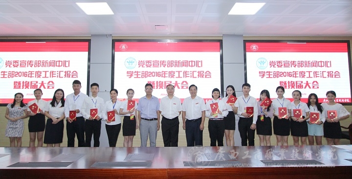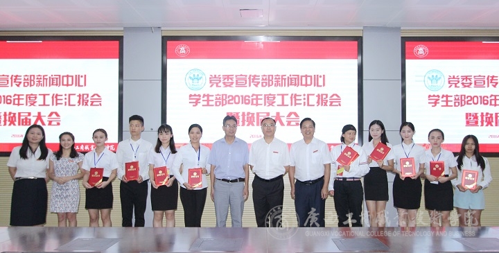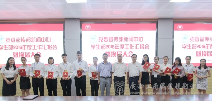 會議最后,由蒙啟成副書記為粟蘭惠、梁禮娜、李蓉榮等新聞中心獲得廣商院2015-2016年“優(yōu)秀記者”的同學頒發(fā)證書;韋勝強部長和林雯副部長分別為新聞中心獲得廣商院“新文化建設(shè)貢獻突出者”、“防艾微電影貢獻者”的同學頒發(fā)證書,韋勝強部長還現(xiàn)場為新聞中心14級全體成員頒發(fā)了聘書。