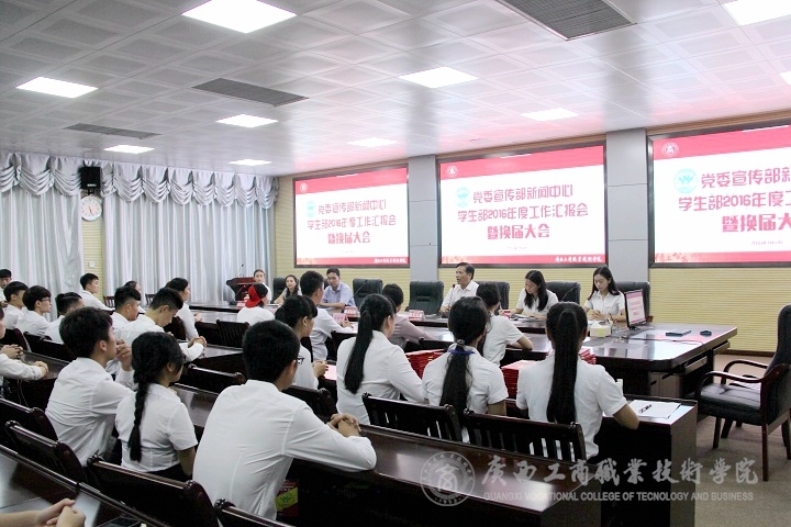 2016年7月12日下午五點,我院在校本部2119視頻會議室舉辦“新聞中心學生部2016年度工作匯報會暨換屆大會?!睂W院黨委副書記蒙啟成、黨委宣傳部部長韋勝強、現(xiàn)教中心主任、黨委宣傳部副部長林雯、新聞中心指導老師、新聞中心學生部全體成員參加了本次大會。會議由新聞中心播主部宋珮瑤主持。
