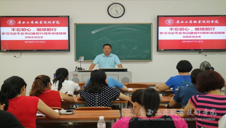 ??????? 與此同時(shí),宣傳部與現(xiàn)教中心黨支部、教務(wù)科研處、財(cái)務(wù)處、會(huì)計(jì)系、經(jīng)管系、財(cái)信系、公共基礎(chǔ)部分別在廣商院2223、學(xué)術(shù)廳、2327、2224、2318、2219等教室和辦公室對(duì)習(xí)總書記的“七一”重要講話進(jìn)行學(xué)習(xí)探討。其中,在2223教室,韋勝?gòu)?qiáng)部長(zhǎng)圍繞八個(gè)“不忘初心、繼續(xù)前進(jìn)”與與會(huì)黨員同志進(jìn)行交流學(xué)習(xí)。他提出,習(xí)近平總書記重要講話中談及青年并給予了厚望,表明了黨對(duì)我國(guó)青年的關(guān)心和關(guān)注,這鼓舞著我院青年教師的成長(zhǎng)。在2219教室,公共基礎(chǔ)部張居設(shè)主任圍繞“立足崗位,開拓進(jìn)取”,就“三十個(gè)要點(diǎn)”為大家闡述中國(guó)共產(chǎn)黨開天辟地的大事件,鼓舞在場(chǎng)的黨員教師們奮發(fā)前行。