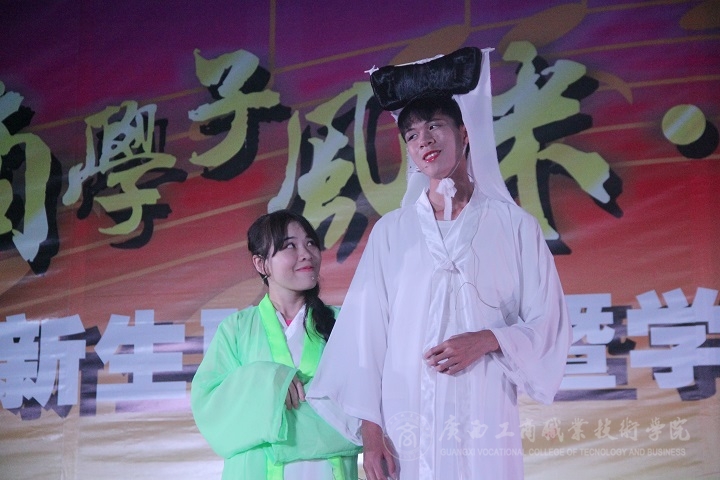 隨后由院大學生藝術團舞蹈隊為大家?guī)砭什⒏挥屑で榛盍Φ奈璧浮禦HYTHM TA》,院大學生藝術團戲劇社演繹幽默詼諧的小品《大話西游》,逗得觀眾哈哈大笑。晚會進行的正精彩,天空不作美下起了小雨,但并未熄滅在座各位觀眾的熱情。學院領導即使沒有撐傘也未受雨的影響,依然注目臺上演員的精彩表現(xiàn)。院大學生藝術團禮儀隊帶來的古今時裝秀帶領同學們領略各個朝代服飾的變遷及風采。接著兄弟院校廣西農業(yè)職業(yè)技術學院藝術團國標隊為我們帶來灑脫自如的國標舞《神話》,把現(xiàn)場氣氛推向一個小高潮,引發(fā)觀眾們的陣陣尖叫聲。由院大學生藝術團戲劇社以及16級新生合作表演的小品《白蛇前傳》,首先出場的是白娘子與小青的蛇身,劇情一轉,許仙悲情一喚,“白姑娘~” 全場新生熱烈回應“哎~”。現(xiàn)場一片沸騰。緊接著由16級新生代表表演的彈唱歌曲《小幸運》,歌曲在吉他的伴奏下,回憶青春片段,引起全場共鳴,觀眾們情不自禁地低聲合唱,紛紛開啟閃光燈高舉手機隨著節(jié)奏輕輕晃動,現(xiàn)場變成一片由閃光燈組成的美麗星海。