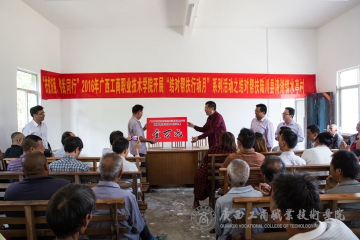下午15時(shí),在經(jīng)過7個(gè)多小時(shí)的長途跋涉后,我院幫扶對順利抵達(dá)水亭村與我院派駐水亭村掛職的第一書記譚爵璽老師和水亭村兩委干部匯合,隨后我院教職工不顧舟車勞頓立即組織開展“結(jié)對幫扶”活動,會上,我院派駐水亭村第一書記譚爵璽老師就2016年水亭村脫貧攻堅(jiān)工作情況向?qū)W院領(lǐng)導(dǎo)和教職工做了簡要匯報(bào),付光處長宣布了學(xué)院開展“結(jié)對幫扶行動月”系列活動之結(jié)對幫扶水亭村的活動正式啟動并對活動如何開展進(jìn)行了布置安排,隨后和林雯主任一同代表學(xué)院向水亭村村委捐贈精準(zhǔn)扶貧工作經(jīng)費(fèi)一萬元整。清湖鎮(zhèn)副鎮(zhèn)長劉奇桂同志在會上代表清湖鎮(zhèn)黨委和政府感謝我院對水亭村精準(zhǔn)扶貧工作的大力支持和無私幫助。