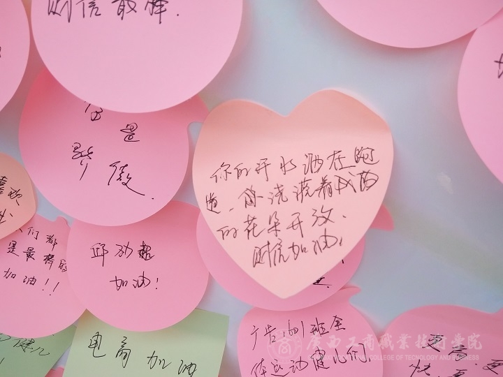 一張紙彩色便簽紙,在不同的人筆墨下綻放如花,點(diǎn)滴語言,匯成一句句祝福與希望。11月3日,在廣商院操場上可以看到這樣一面特殊的“墻”,數(shù)百名同學(xué)在此留下“花兒朵朵”。