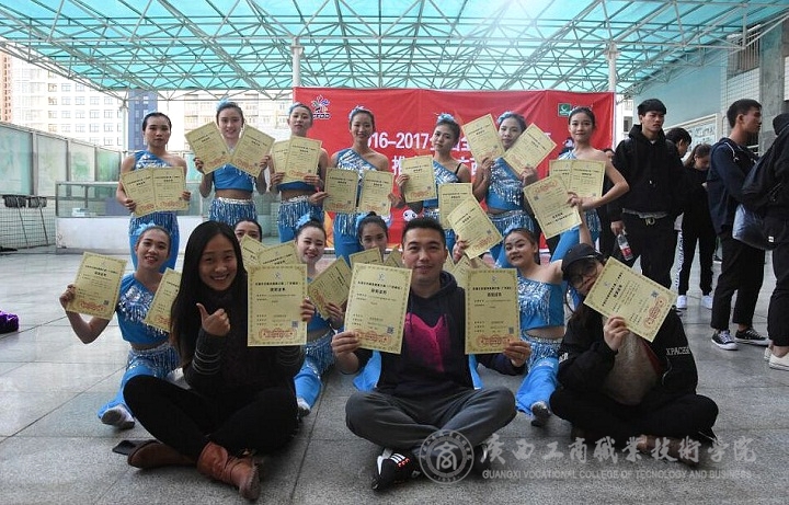 此次廣西分站賽,我院組成了由公共部副主任朱武壽老師領(lǐng)隊,尹成功老師為總教練,盧炳秋老師和曾昭婷老師為助理教練的團隊,精心選拔參賽隊員,并進行了近一個月的刻苦訓練,共報名參加大學普通院校組的五個項目比賽。比賽中,在教練員團隊的悉心指導下,運動隊員緊密協(xié)作,發(fā)揮出色,在大學普通院校組比賽中,街舞Breaking自選動作項目中勇奪桂冠(特等獎),2016年全國民族健身操規(guī)定傣族動作項目中榮獲一等獎,民族健身操自選動作項目榮獲一等獎,綜合齊舞風格自選動作項目榮獲二等獎,2015年全國街舞推廣套路Hiphop項目榮獲二等獎。同時在此次比賽中,教練團全體成員均榮獲 “優(yōu)秀教練員”稱號。值得一提的是,作為我院本次出征團隊總教練的尹成功老師還是全國健身操舞國家一級裁判員、教練員。