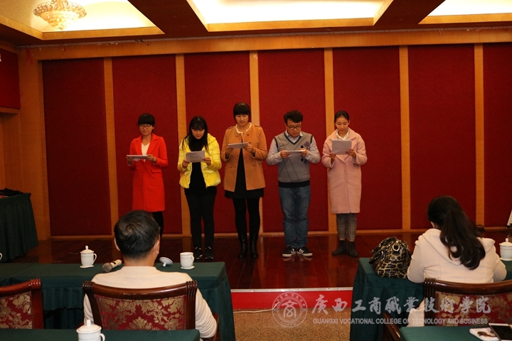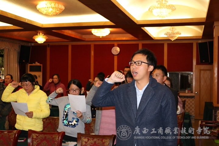 ??????? 11月25日下午14:30,學(xué)院工會(huì)在南寧市會(huì)議中心第五會(huì)議室舉辦了新會(huì)員入會(huì)儀式暨工會(huì)干部培訓(xùn)班,學(xué)院工會(huì)主席蒙啟成、常務(wù)副主席陳承偉、專職副主席王桂玲出席了本次培訓(xùn)。學(xué)院工會(huì)干部和新會(huì)員共同參會(huì)。