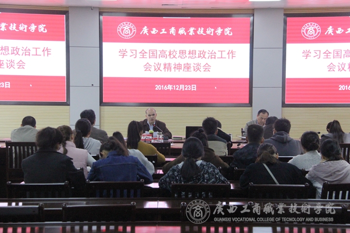 ??????? 2016 年 12 月 23 日上午,我院在校本部召開學習全國高校思想政治工作會議精神座談會。學院黨委書記覃武云,黨委副書記、紀委書記蒙啟成出席會議。黨委組織部、黨委宣傳部、黨委學生工作部、教務(wù)科研處、后勤管理處主要負責人,各系學生代表參加了此次會議。