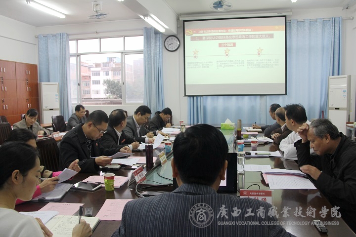 本次會(huì)議圍繞“學(xué)習(xí)全國(guó)高校思想政治工作會(huì)議精神”展開,會(huì)議學(xué)習(xí)了全國(guó)高校思想政治工作會(huì)議精神,討論研究了《廣西工商職業(yè)技術(shù)學(xué)院科級(jí)管理人員管理辦法(試行)》,聽取了學(xué)院工會(huì)作2016年度教代會(huì)工作安排匯報(bào)和2017年度教代會(huì)工作安排匯報(bào),聽取了黨委組織部(學(xué)院人事處)作2016年度教職工年度考核、評(píng)優(yōu)方案匯報(bào),聽取了黨委辦公室作學(xué)院黨委2016年度工作總結(jié)、2017年度工作思路匯報(bào),聽取了學(xué)院辦公室作學(xué)院2016年度工作總結(jié)、2017年度工作思路匯報(bào)。