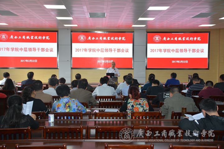 ? ? ? ? 2月22日下午,學(xué)院在校本部召開中層以上領(lǐng)導(dǎo)干部會(huì)議。學(xué)院黨委學(xué)校黨委書記覃武云同志、黨委副書記、紀(jì)委書記蒙啟成同志、學(xué)院副院長陳寧春同志出席會(huì)議。學(xué)院中層以上領(lǐng)導(dǎo)干部參加會(huì)議。會(huì)議聽取各部門主要負(fù)責(zé)人匯報(bào)2017年本部門的工作思路,包括黨建工作思路和行政工作思路。