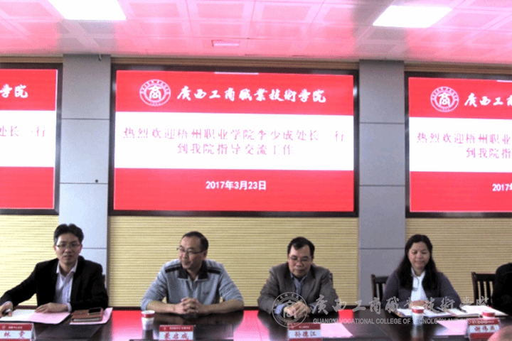 ??????? 2017年3月23日上午,梧州職業(yè)學(xué)院學(xué)工處李少成處長(zhǎng)一行10人到我院就數(shù)字化校園建設(shè)、關(guān)鍵信息系統(tǒng)運(yùn)行和教學(xué)信息化、學(xué)生管理、財(cái)務(wù)流程管理、后勤管理等方面內(nèi)容進(jìn)行了對(duì)口經(jīng)驗(yàn)交流。我院蒙啟成副書(shū)記出席交流會(huì), 學(xué)生工作部孫德江部長(zhǎng)、現(xiàn)教中心林雯主任主持會(huì)議,學(xué)院教務(wù)科研處、黨委辦公室、后勤管理處、財(cái)務(wù)處相關(guān)負(fù)責(zé)人參加會(huì)議。