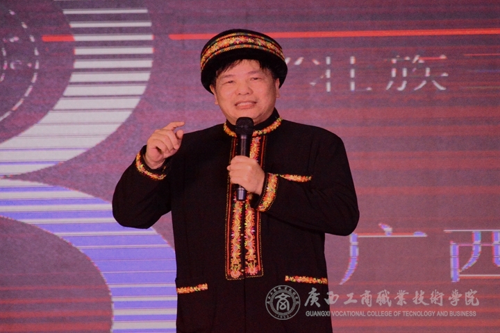 活動(dòng)由傳說(shuō)中的“瑤哥”,宣傳部部長(zhǎng)韋勝?gòu)?qiáng)擔(dān)任主持人。他身著瑤族服裝,戴瑤族帽,一上場(chǎng)就給現(xiàn)場(chǎng)師生不一樣的視覺(jué)感受。介紹活動(dòng)嘉賓和活動(dòng)安排后,“瑤哥”含著笑將舞臺(tái)交給活動(dòng)主講人蒙啟成副書(shū)記。
