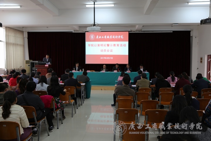 根據(jù)《關(guān)于印發(fā)自治區(qū)糧食局開展以案明紀(jì)警示教育活動實施方案的通知》(桂糧直紀(jì)〔2017〕7 號)精神,我院于 2017 年 3 月 27 日下午,在校本部報告廳召開學(xué)院以案明紀(jì)警示教育活動動員會議。學(xué)院全體領(lǐng)導(dǎo)班子成員出席會議,學(xué)院黨委委員、紀(jì)委委員;中層干部;各黨總支、直屬黨支部、各系教師黨支部、學(xué)生黨支部書記、副書記及委員參加會議。