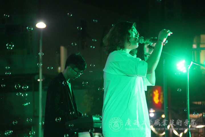 在大家的歡呼下,南職“大藥丸”樂隊也隨之閃亮登場,主唱率性灑脫的演唱與吉他手、鼓手的精彩演奏完美結合,兩位主唱的三首歌下來,博得了場下“迷”妹“迷”弟們一陣熱烈的掌聲。