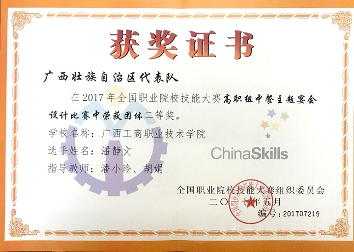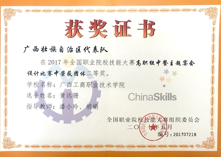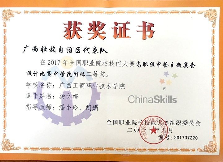 2017年5月18日-5月21日,2017年全國職業(yè)院校技能大賽(高職組)中餐主題宴會設(shè)計賽項在青島酒店管理職業(yè)技術(shù)學(xué)院舉辦。本賽項共有來自全國各地的83所職業(yè)院校249名選手參賽。學(xué)院派出酒店1501班的楊文婷、潘靜文和酒店1603班的黃遠(yuǎn)珊三名同學(xué)組成的參賽團隊參加了本次比賽。經(jīng)過三天激烈的比拼,姑娘們以全國第十七名的總成績榮獲二等獎。這是繼榮獲廣西職業(yè)院校技能大賽(高職組)中餐主題宴會設(shè)計賽項一等獎后,再次刷新紀(jì)錄,創(chuàng)造了學(xué)院酒店管理專業(yè)參加此項賽事以來的最好成績。