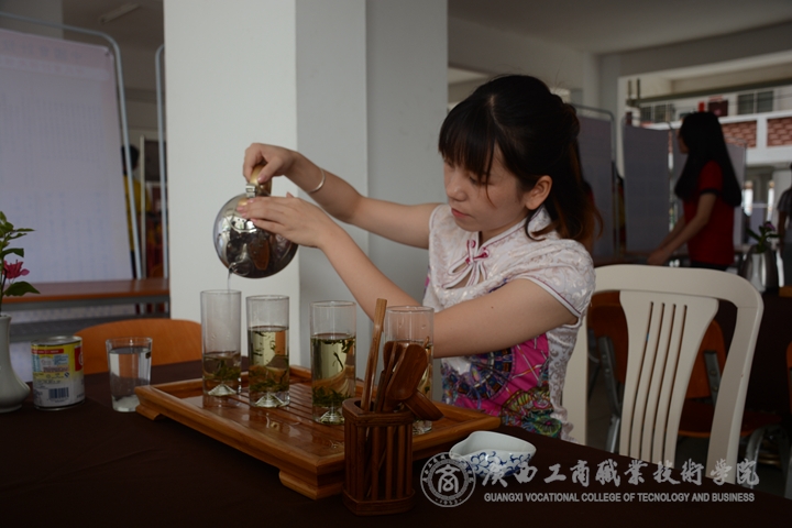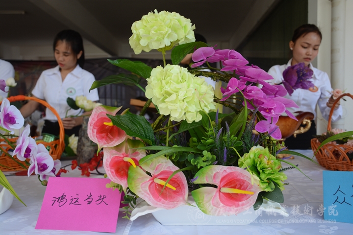 另外還有餐桌禮儀展示,展現(xiàn)了中西文化的融合。在茶藝展示過程中,技能人員表情專注、心態(tài)平和、認真操作,讓圍觀的老師和同學在欣賞茶藝展示過程中去體會飲茶之樂,去享受生活的美好。隨后的花藝展示中,酒管的同學們用一雙心靈手巧的手,向在場的觀眾展示了插花的魅力。