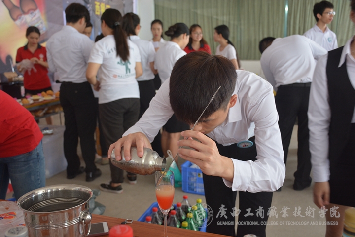 只見活動開始,調(diào)酒師們調(diào)制了五種顏色不一樣的雞尾酒,并將它們搭建成一座“金字塔”,成為展演過程中的一大亮點,吸引了許多同學圍觀并拍照留念。