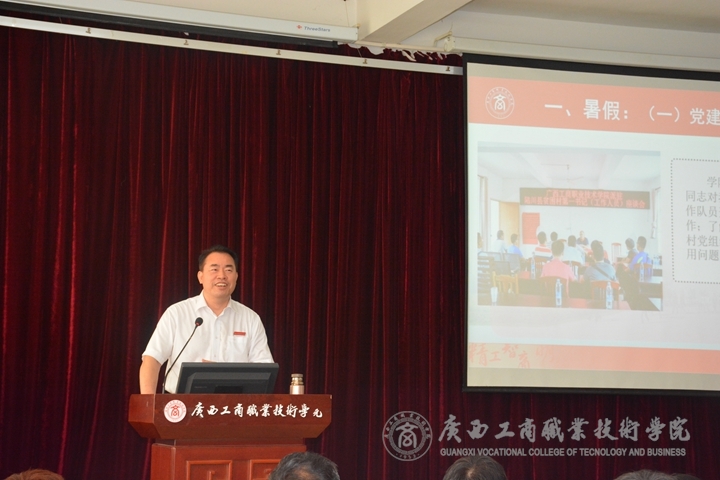 ?????? 隨后,由陳杰做開學(xué)工作報告。陳杰主要從暑假工作、開學(xué)工作、學(xué)期重點工作三大方面進行報告。他回顧總結(jié)了暑假期間黨建、教學(xué)、學(xué)工、人才、服務(wù)、民生、武鳴校區(qū)建設(shè)等各項工作開展情況,并做了開學(xué)工作及學(xué)期重點工作安排。報告將“堅持黨的領(lǐng)導(dǎo),落實管黨治黨、辦學(xué)治校主體責(zé)任”等六項黨建工作和持續(xù)推動以“提高教師素質(zhì)”為重點的教學(xué)水平升級等五項行政工作作為重點工作。