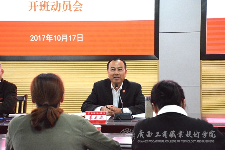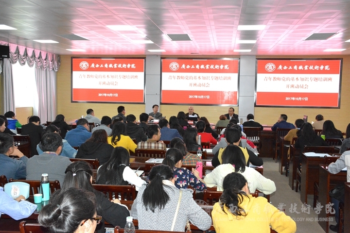 ? ? ? ? 2017 年 10 月 17 日下午,我院召開(kāi)青年教師黨的基本知識(shí)專(zhuān)題培訓(xùn)班開(kāi)班動(dòng)員會(huì),學(xué)院黨委書(shū)記覃武云作開(kāi)班動(dòng)員講話并主講題為《中國(guó)共產(chǎn)黨的歷史》(趕考及思考)專(zhuān)題理論學(xué)習(xí)第一課。本次動(dòng)員會(huì)由學(xué)院黨委副書(shū)記、紀(jì)委書(shū)記蒙啟成主持,學(xué)院 35 歲以下(含 35 歲)全體青年教師共110多人作為學(xué)員參加了動(dòng)員會(huì)。