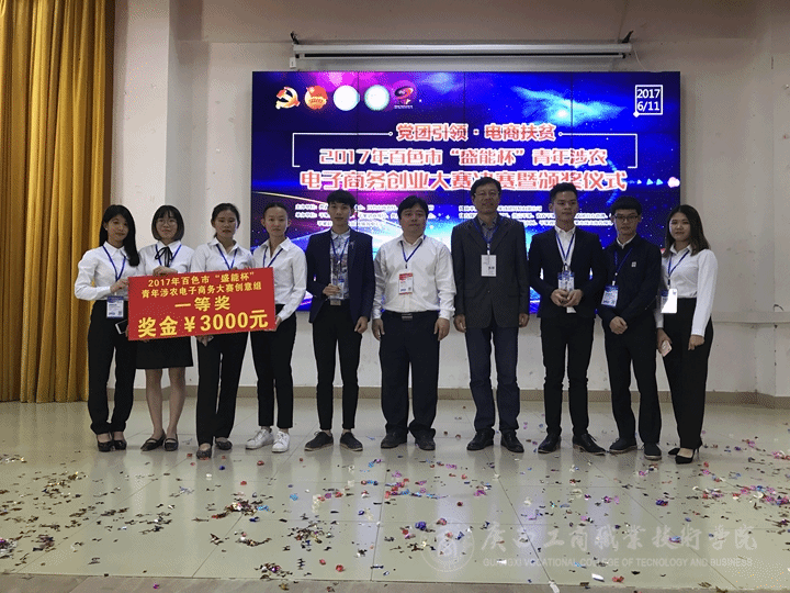? ? ? ? ?2017年11月6日,百色市“盛能杯”青年涉農(nóng)電子商務(wù)大賽決賽在廣西幼兒師范高等專科學(xué)院鳴鑼開(kāi)賽,我院選派了電商16級(jí)三支隊(duì)伍參賽,并榮獲大賽一、二等獎(jiǎng),包攬了比賽前三名。其中,李富、楊晨鈺、覃彩瑩、盧海瑜團(tuán)隊(duì)的《蛋七彩》項(xiàng)目榮獲一等獎(jiǎng)和3000元獎(jiǎng)金;賓觀華、蒙坤龍、劉小鳳、農(nóng)燕嬌團(tuán)隊(duì)的《果果實(shí)驗(yàn)室》項(xiàng)目和牙蘭向、李紹范、馮雪梅、蘇宣瑾、蔡宗霖團(tuán)隊(duì)的《果娘娘水果助農(nóng)電商商業(yè)計(jì)劃》項(xiàng)目分別榮獲二等獎(jiǎng),2000元獎(jiǎng)金。