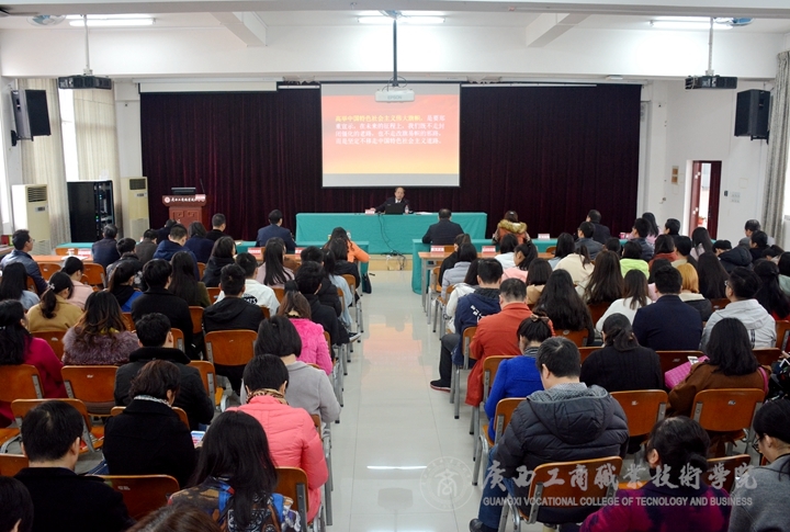 ? ? ? ? 為推進(jìn)深入學(xué)習(xí)宣傳貫徹黨的十九大精神, 12月22日上午,我院舉辦黨的十九大精神宣講報(bào)告會(huì),邀請(qǐng)自治區(qū)北部灣經(jīng)濟(jì)區(qū)和東盟開放合作辦公室副主任、黨組成員梁金榮作了題為《深入領(lǐng)會(huì)十九大精神 奮力譜寫青春新華章》的宣講報(bào)告。學(xué)院黨委副書記、院長(zhǎng)陳杰主持報(bào)告會(huì),學(xué)院全體教職工和學(xué)生代表參加報(bào)告會(huì)。