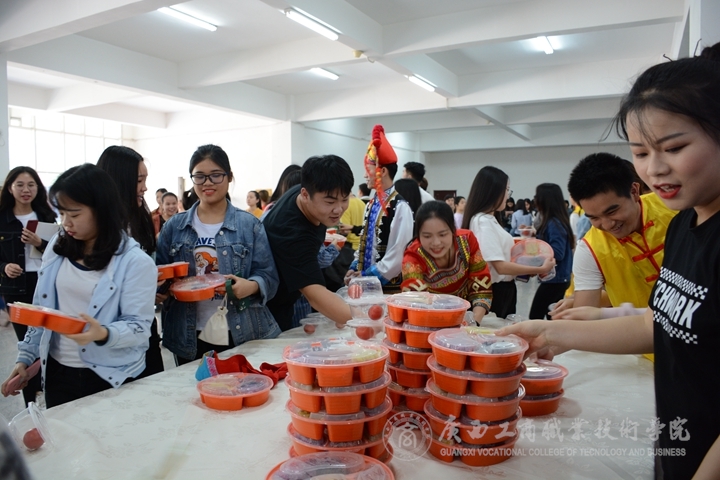 ??????? 2018年4月16日下午,廣西工商職業(yè)技術學院鵬飛校區(qū)文體館一樓,傳出一片歡聲笑語,純植物染就的五色糯米飯飄香繞梁?!笆裁撮_花節(jié)節(jié)高呢,嘿撩撩螺”一陣陣動聽的山歌飛出文體館,在校園里回蕩。